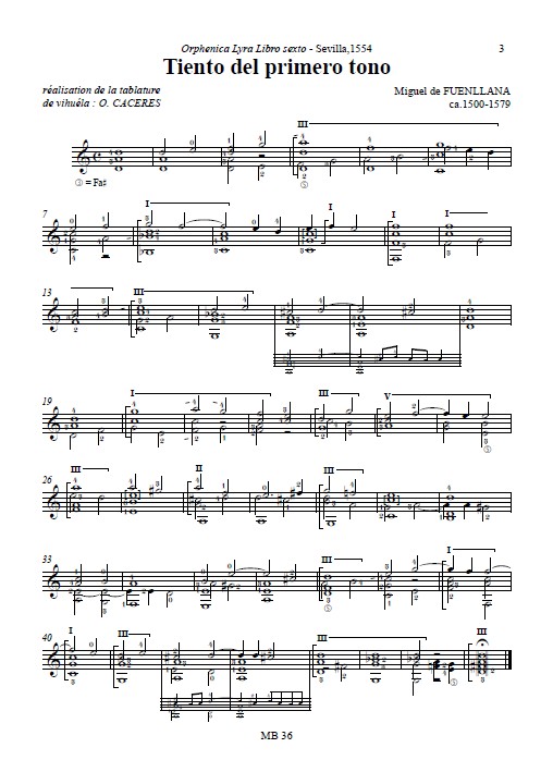 Miguel de Fuenllana Ocho tientos para los ocho tonos –réalisation des tablatures de vihuéla : O. Cacérès, révision : M. Bataïni avancé – guitare seule